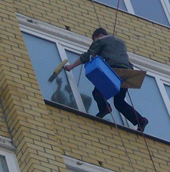 Мойка окон на высоте с использованием метода промальпа включает также очистку рам, откосов, наружных подоконников, антимоскитных сеток.