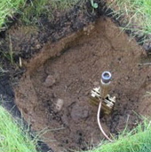 Устройство заземлителя, забивка первого стержня в землю, осуществляется с помощью вибромолота. Затем происходит соединение первого и второго стержней и снова забивка в землю. В грунт помещать стержни можно двумя способами: вибрацией или забиванием. Например, устройство заземления на даче, которая находится на глинистых грунтах, осуществляется с помощью забивки стержня вибромолотом. На количество электродов влияет их размер, сопротивление грунта, глубина промерзания и др. Глубина установки должна быть не менее 0,7 м. Устанавливать электроды следует на расстоянии 2 м от фундамента.