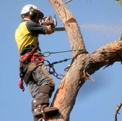 Арборист в альпинистском снаряжении удаляет верхушку строгого дерева